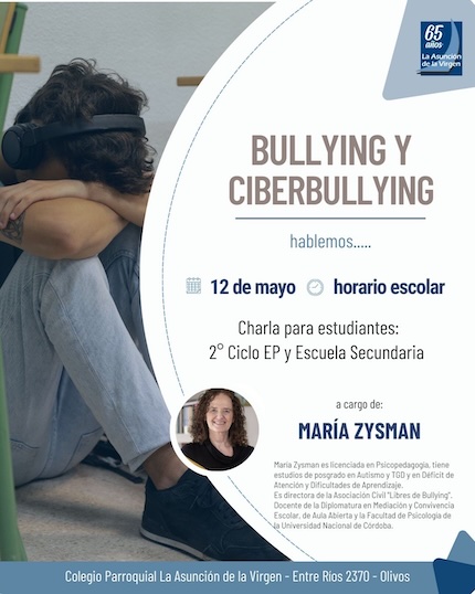 Realizaremos una charla con los estudiantes de 2° Ciclo de la Escuela Primaria y toda la Escuela Secundaria, el próximo 12 de mayo en horario escolar coordinada por Licenciada María Zysman.